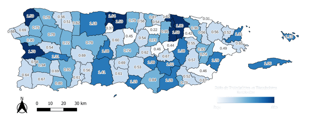 Adicional, podemos ver como Guaynabo se alza entre los municipios que mayor cantidad de trabajadores atrae, indicando ser un municipio de foco de empleo. Mientras, Caguas pierde su posición entre los Top 5 municipios que atrae mayor cantidad de trabajadores. Esto nos brinda la oportunidad de estudiar la relación de trabajadores y trabajadores-residentes con el siguiente ratio: Trabajadores/Trabajadores Residentes. Lo que demuestra cuantos trabajadores hay por cantidad de trabajadores-residentes. Podemos identificar: