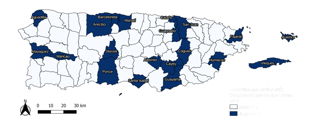Adicional, podemos identificar cuales son esos municipios donde el ratio es más de 1. Lo que significa que absorben más trabajadores que la cantidad de trabajadores-residentes en ese municipio, convirtiéndolos en Focos de Empleo.